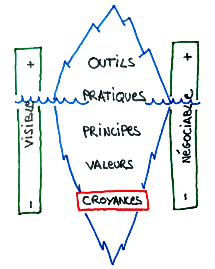 Prendre conscience c’est avoir déjà fait un grand pas vers la résolution du problème. Il me paraît important de comprendre que les problématiques liées à la mise en place de l’Agilité ne sont pas situent pas nécessairement aux niveaux des outils, des pratiques, des principes ou des valeurs. Elles peuvent aussi se situer au niveau des croyances.