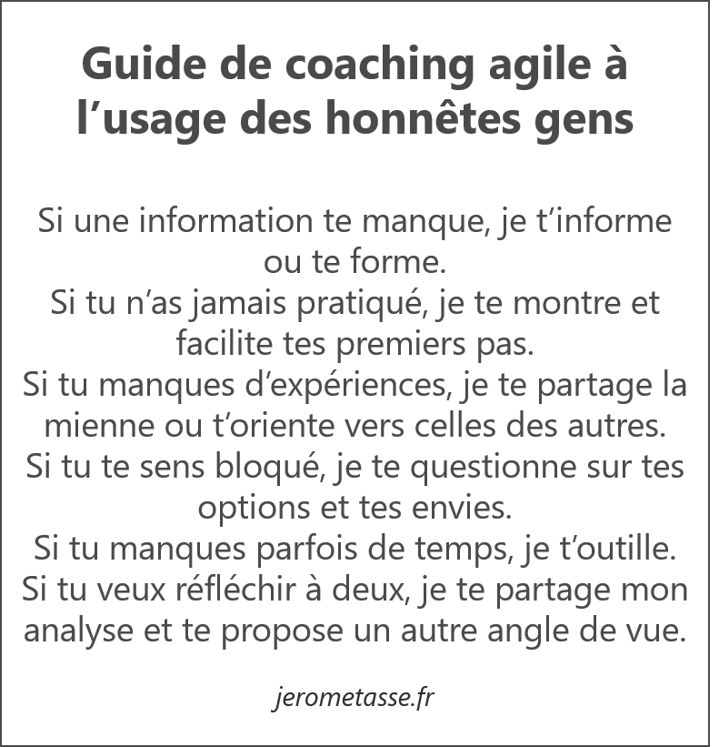 Je vous partage donc mon « Guide de coaching agile à l’usage des honnêtes gens » que j’ai construite au fil de mon expérience et sur laquelle je m’appuie lors que j’ai des doutes sur la posture à prendre. Je la partage par ailleurs à mes clients pour partager ce savoir et leur permettre d’obtenir leur meilleur accompagnement possible tout comme de m’alerter si ma posture ne leur semble pas adapté à la situation.