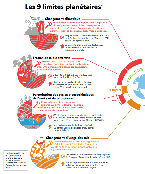 Le ministère de la transition écologique et de la cohésion des territoires a publié en octobre 2023 un rapport évaluant la France sur les 9 limites planétaires à l’origine des travaux de Johan Rockström. Là aussi, des limites existent pour nous permettre de vivre en harmonie avec notre environnement. C’est le grand enjeu de notre siècle. Vous trouverez ci-dessous une double page de la synthèse du rapport (les pages 5 à 9 vous définirons les 9 limites de manière quantitative).